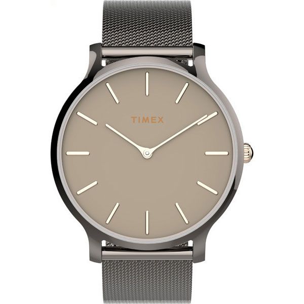 Женские кварцевые часы. Центральные часовая и минутная стрелки. Бежевый циферблат. Круглый корпус выполнен из латуни с темно-серым IP покрытием. Диаметр корпуса составляет 38 мм. Стальной браслет шириной 18 мм выполнен в технике миланского плетения, раскладная застежка. Прочное минеральное стекло устойчивое к мелким механическим повреждениям. Водостойкость WR 50 (мытье рук, дождь).