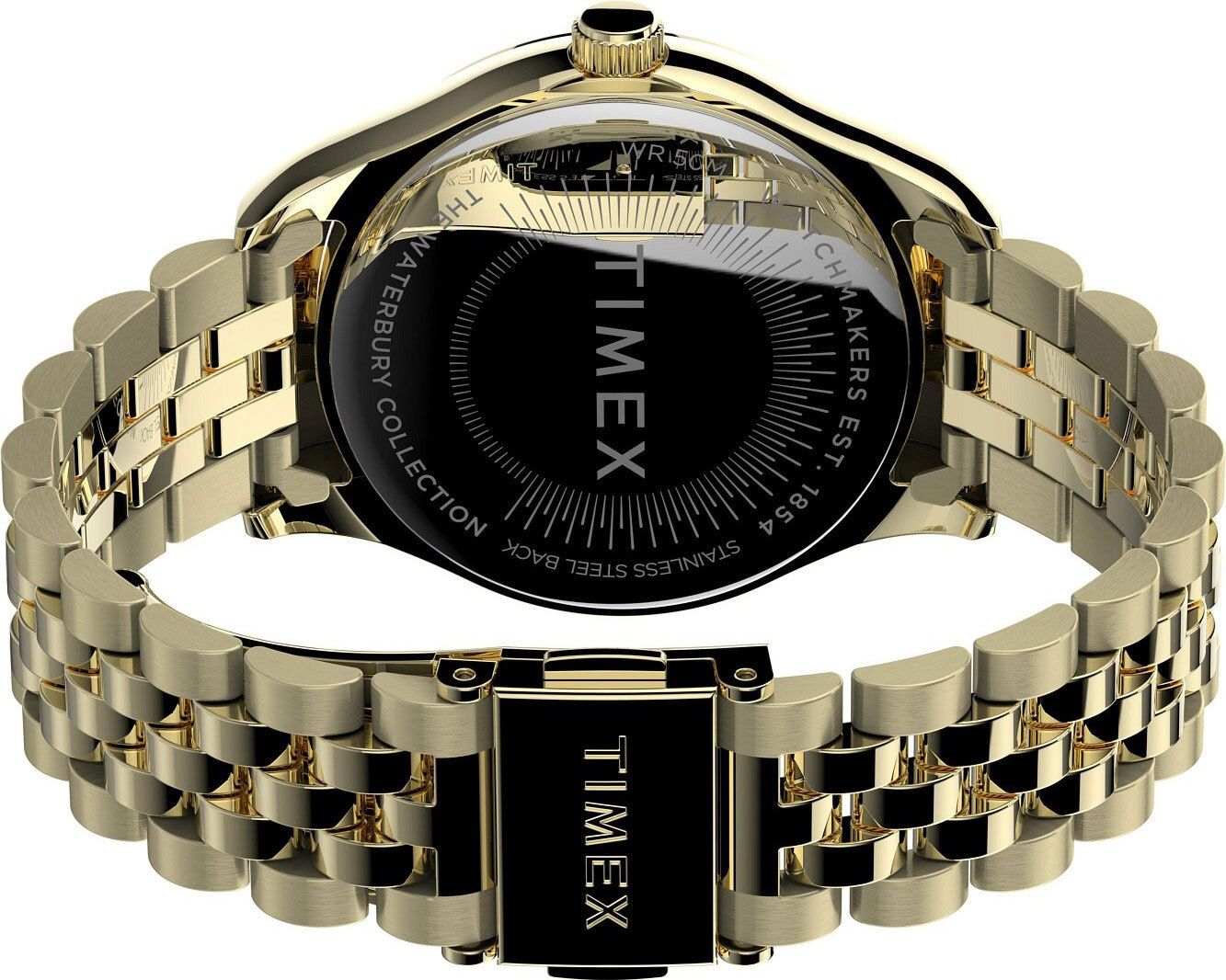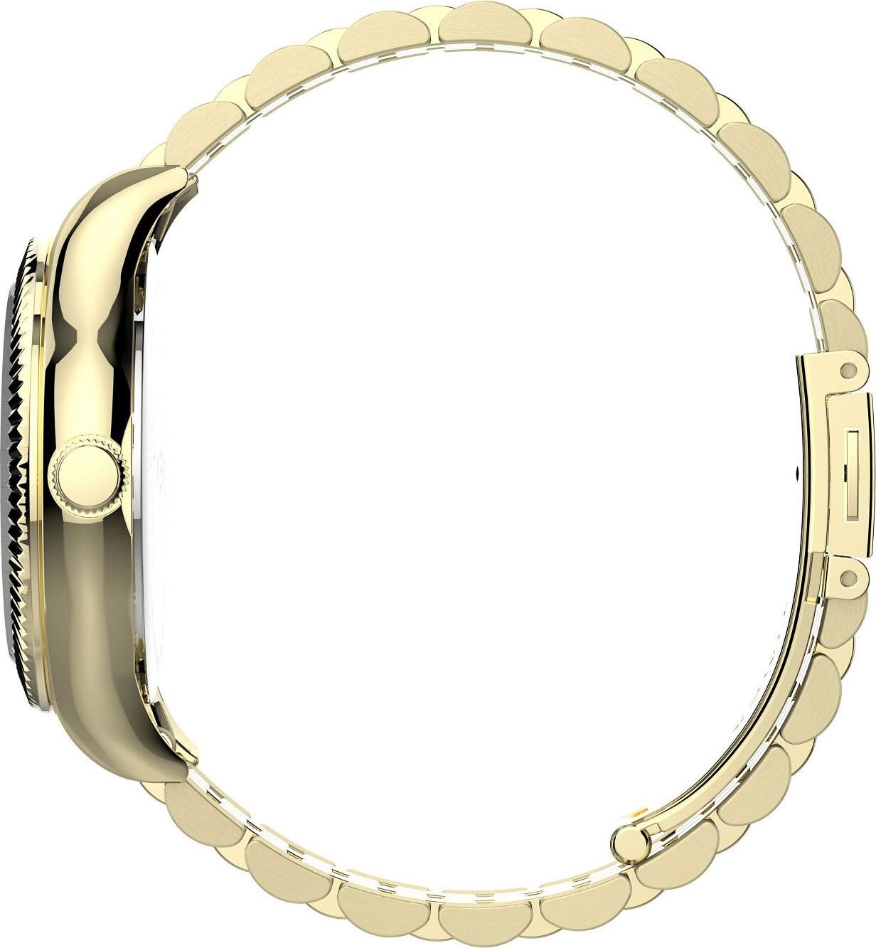Женские кварцевые часы. Центральные часовая, минутная и секундная стрелки. Апертура даты с увеличительным стеклом в позиции 3 часов. Коричневый циферблат с текстурой под дерево. Круглый корпус выполнен из полированной нержавеющей стали с PVD покрытием цвета желтого золота. Диаметр корпуса составляет 34 мм. Стальной браслет с покрытием шириной 16 мм, раскладывающаяся застежка. Прочное минеральное стекло устойчивое к мелким механическим повреждениям. Водостойкость WR 50 (мытье рук, дождь).