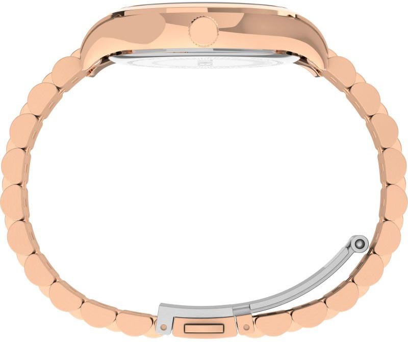 Женские аналоговые кварцевые часы. Коллекция Waterbury Neon. Центральные часовая, минутная и секундная стрелки. Бежевый циферблат с часовыми индексами в виде штрихов. Светонакопительный состав на стрелках. Корпус выполнен из нержавеющей стали с IP покрытием цвета розового золота. Подсветка Indiglo демонстрирует силуэт губ на циферблате (Indiglo - запатентованная технология компании Timex, представляющая собой электролюминесцентную панель нежно-зеленого или голубого цвета, с помощью которой подсвечивается весь циферблат) . Диаметр корпуса 34 мм. Устойчивое к возникновению мелких механических повреждений минеральное стекло. Браслет выполнен из нержавеющей стали с IP покрытием цвета розового золота. Ширина браслета 16 мм. Водостойкость WR 50 (мытьё рук, дождь).