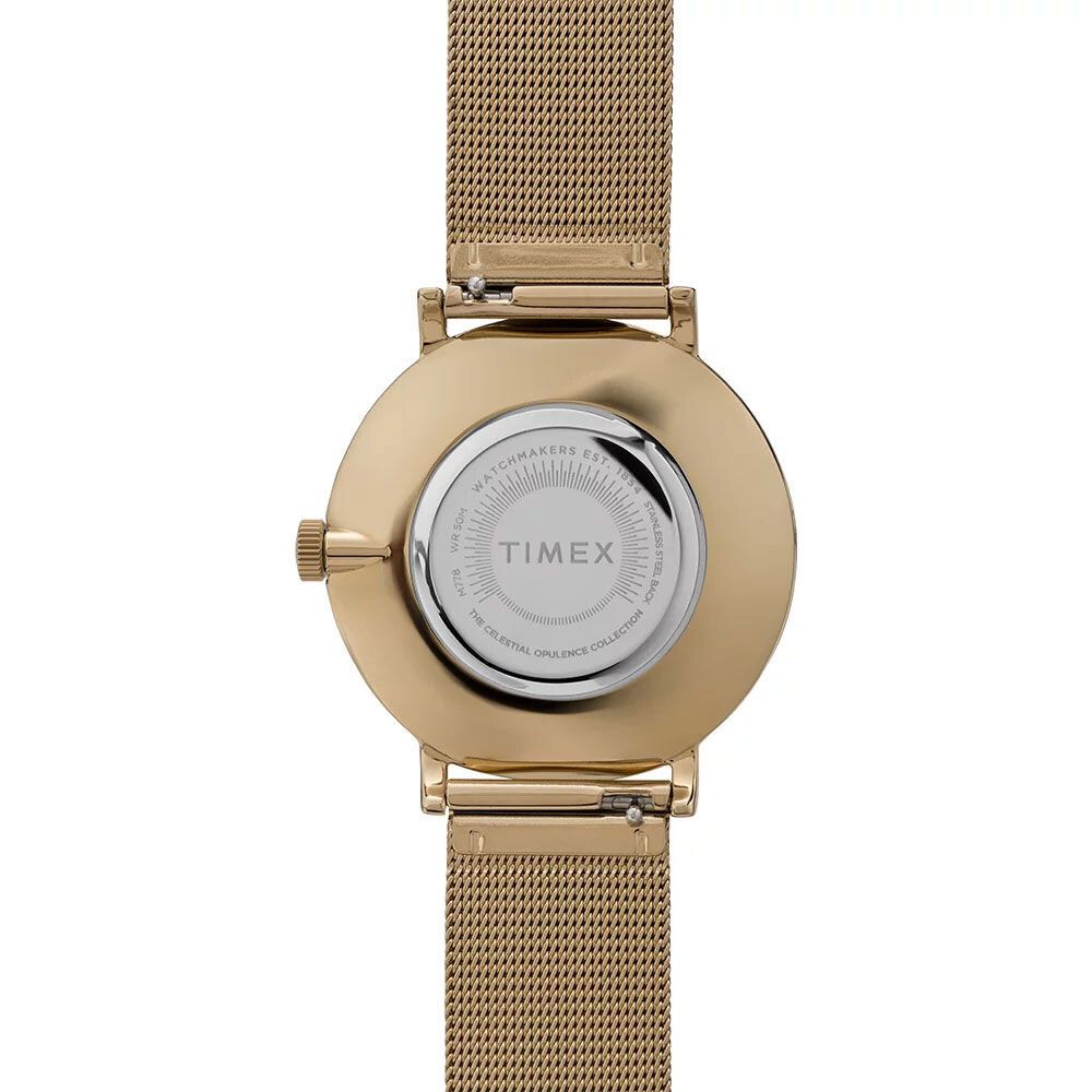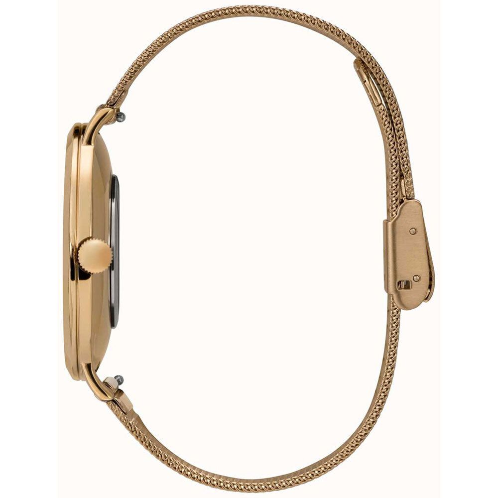 Женские кварцевые часы. Центральные часовая, минутная и секундная стрелки. Серебристый циферблат украшен блестками и кристаллами. Круглый корпус выполнен из нержавеющей стали с PVD покрытием цвета желтого золота. Диаметр корпуса составляет 38 мм, толщина 8 мм. Стальной браслет с покрытием шириной 18 мм выполнен в технике миланского плетения, раскладная застежка. Прочное минеральное стекло устойчивое к мелким механическим повреждениям. Водостойкость WR 50 (мытье рук, дождь).