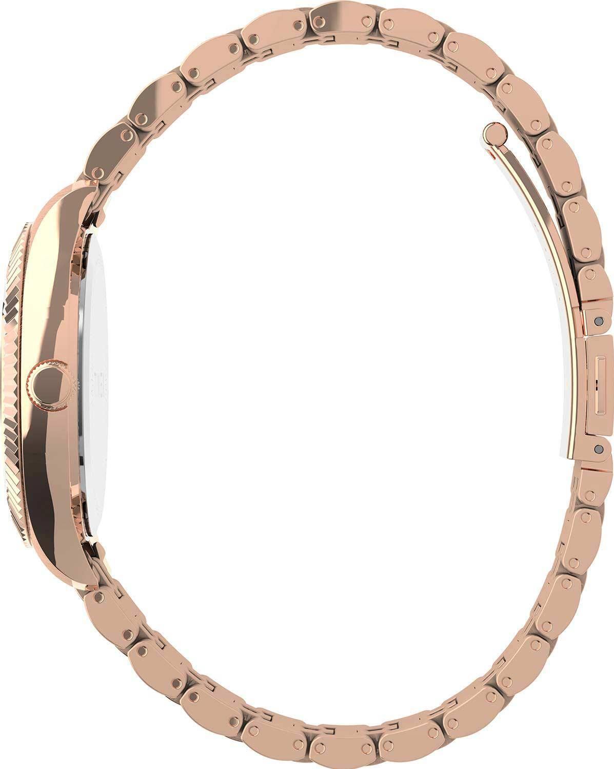 Кварцевые часы. Водостойкость WR 50. Центральные часовая, минутная и секундная стрелки. Индикация даты и дня недели. Розовый циферблат с часовыми индексами в виде штрихов. Металлический корпус с PVD покрытием. Диаметр корпуса 36 мм. Устойчивое к возникновению мелких механических повреждений минеральное стекло. Металлический браслет с PVD покрытием. Ширина браслета 18 мм.