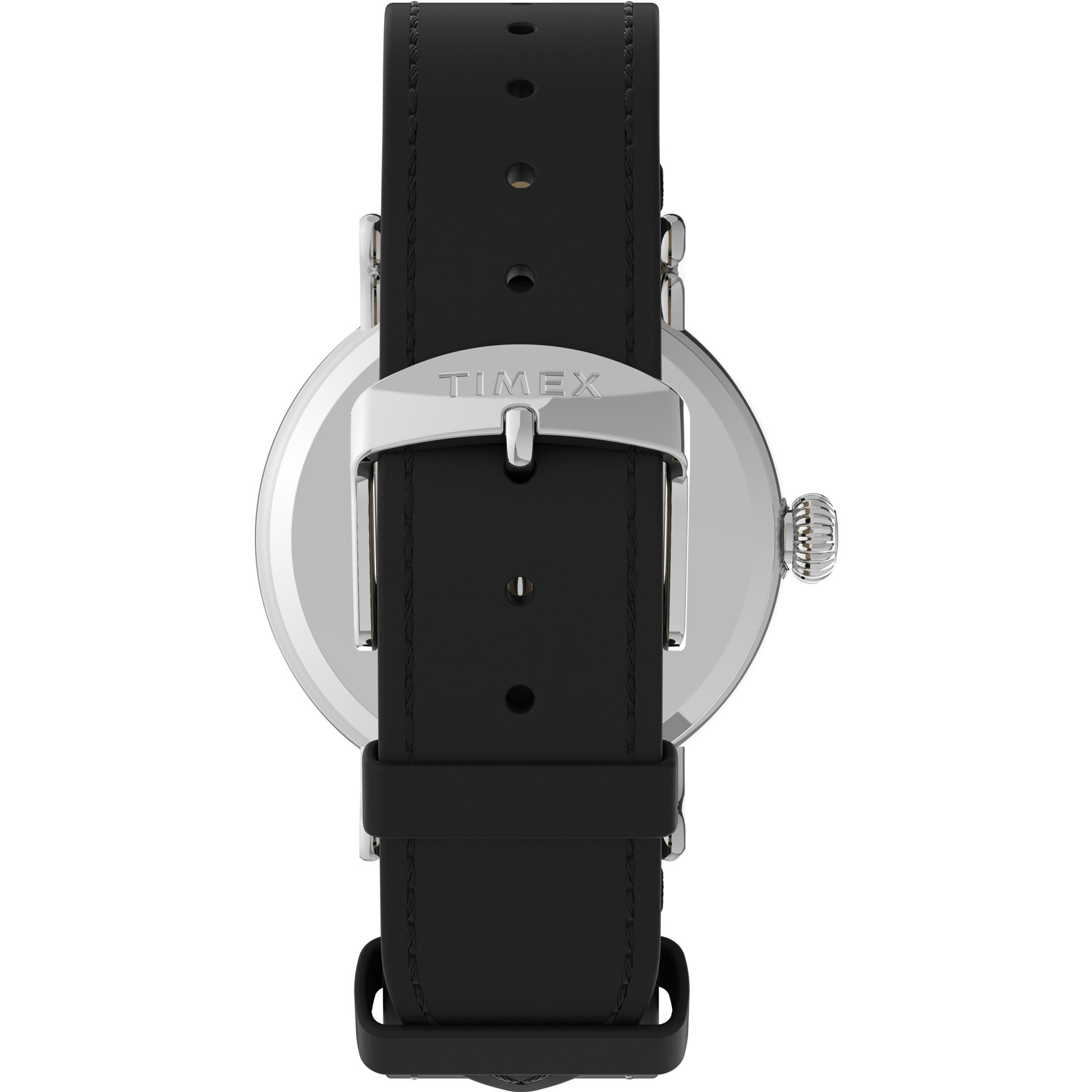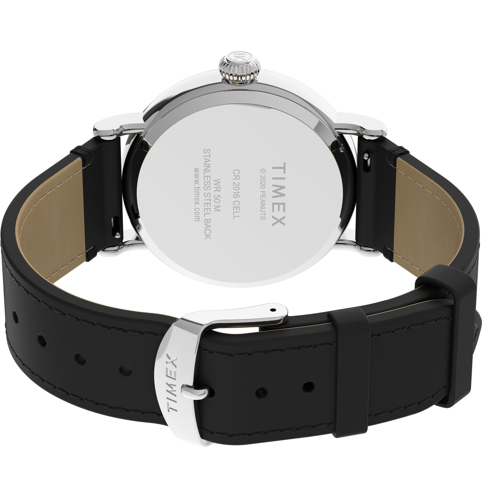Кварцевые аналоговые наручные часы. Коллекция Timex Standart Peanuts (Snoopy Christmas). Центральные часовая, минутная и секундная стрелки. Арабские цифры. Стрелки и метки покрыты люминесцентным составом (светятся в темноте после непродолжительного нахождения на свету). Круглый корпус диаметром 40 мм. Белый циферблат с изображением щенка Snoopy. Подсветка INDIGLO (Indiglo -запатентованная технология компании Timex, представляющая собой электролюминесцентную панель нежно-зеленого или голубого цвета, с помощью которой подсвечивается весь циферблат). Чёрный кожаный ремешок с классической застёжкой. Водозащита 30 WR (брызги).