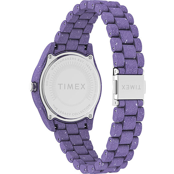 Женские аналоговые кварцевые наручные часы. Коллекция Legacy Ocean (наследие океана). Корпус, ремешок и циферблат часов изготовлены из переработанного пластика, собранного в океане (#tide ocean material). Центральные часовая, минутная и секундная стрелки. Фиолетовый циферблат с часовыми индексами в виде штрихов. Стрелки и метки с люминесцентным покрытием, которое светится в темноте после непродолжительной зарядки на свету. Устойчивое к мелким механическим повреждениям минеральное стекло. Круглый корпус выполнен из переработанного пластика, собранного в океане. Диаметр корпуса 37 мм. Рифленая переводная головка. Фиолетовый ремешок из переработанного пластика, собранного в океане. Ширина ремешка 18 мм. Водозащита 30 WR (брызги).