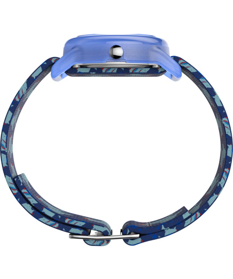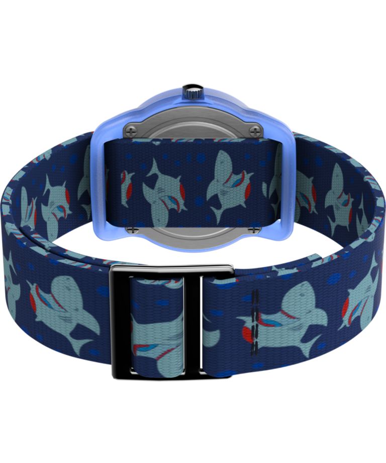 Детские кварцевые аналоговые наручные часы. Центральные часовая и минутная стрелки. Секундная стрелка в виде акулы. Арабская индикация времени. 12-24-х часовой формат времени. Круглый пластиковый корпус голубого цвета диаметром 28 мм, толщиной 9 мм. Синий тканевый ремешок с изображениями акул. Водозащита 30WR (брызги).