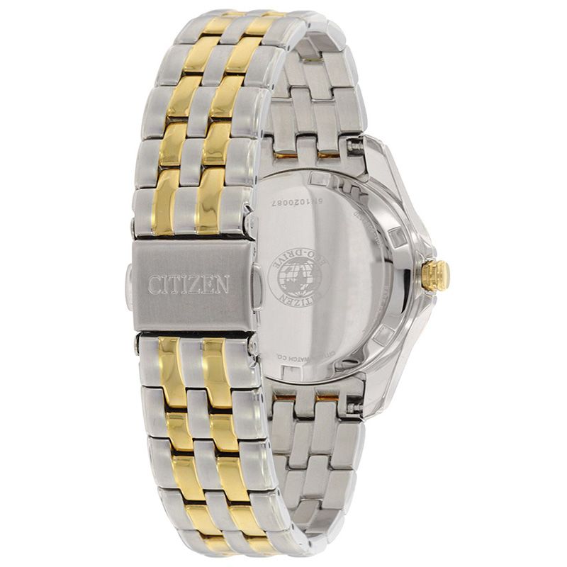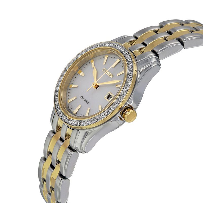 Женские кварцевые аналоговые наручные часы на солнечной батарее. Коллекция Eco-Drive Elegance. Калибр механизма Citizen E011. Часы оснащенный системой питания и подзарядки от солнечного света Eco-Drive не требующей замены батарейки. Система Eco-Drive - патентованная технология Citizen, заключающаяся в размещении фотоэлементов скрытых под циферблатом и постоянно заряжающих аккумулятор часов при попадании солнечного света на циферблат. Запас хода до 180 дней от полностью заряженной батареи. Функция индикации заряда (EOL - End of Life) – в случае ослабевания заряда элемента питания секундная стрелка перемещается с интервалом в 2 секунды. Функция предотвращения перезарядки. Центральные часовая, минутная и секундная стрелки золотистого цвета. Серебристый циферблат с часовыми метками в виде золотистых штрихов. Индикация даты в позиции 3 часов. Круглый стальной корпус с IP покрытием цвета розового золота на безеле. Безель украшен кристаллами. Диаметр корпуса 28 мм, толщина 9 мм. Рифлёная переводная головка с защитой. Устойчивое к мелким механическим повреждениям минеральное стекло. Стальной браслет с частичным IP покрытием цвета розового золота, раскладывающаяся застежка. Ширина браслета 14 мм. Завинчивающаяся задняя крышка. Водонепроницаемость 100WR (часы подходят для плавания с маской, трубкой, обычного плавания). Вес около 80 г.