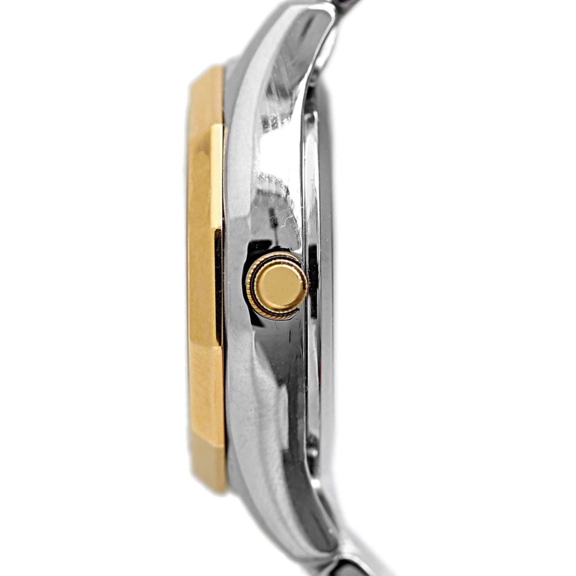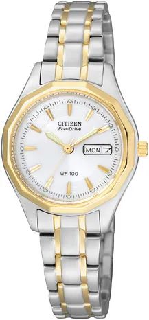 Женские кварцевые аналоговые часы на солнечной батарее. Коллекция Eco-Drive. Калибр механизма Citizen E001. Питание от солнечной энергии - часы оснащены системой Eco-Drive не требующей замены батарейки. Система Eco-Drive - патентованная технология Citizen, заключающаяся в размещении фотоэлементов скрытых под циферблатом и постоянно заряжающих аккумулятор часов при попадании солнечного света на циферблат. Запас хода около 180 дней от полностью заряженной батареи. Функция индикации заряда (EOL - End of Life) – в случае ослабевания заряда элемента питания секундная стрелка перемещается через 2 деления. Функция предотвращения перезарядки. Центральные часовая, минутная и секундная стрелки. Индикация даты и дня недели в позиции 3 часов. Серебристый циферблат с часовыми метками в виде штрихов. Стрелки и часовые метки с люминесцентным покрытием, которое светится в темноте после непродолжительного воздействия света. Круглый корпус из нержавеющей стали с IP покрытием цвета жёлтого золота на безеле. Диаметр корпуса 26,5 мм, толщина 8,4 мм. Устойчивое к мелким механическим повреждениям минеральное стекло. Стальной браслет с частичным IP покрытием цвета жёлтого золота, раскладывающаяся застежка. Водонепроницаемость 100WR (часы подходят для плавания с маской, трубкой и обычного плавания). Вес около 57 г.