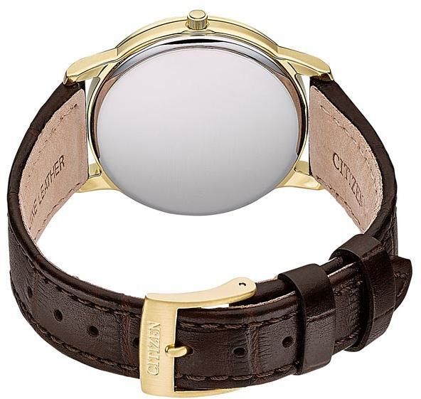Женские кварцевые часы. Питание от солнечной энергии, запас энергии на 240 дней. Точный японский механизм Citizen J810. Центральные часовая, минутная и секундная стрелки. Апертура даты в позиции 3 часов. Функция индикации заряда батареи (EOL). Белый циферблат. Корпус выполнен из полированной нержавеющей стали с IP покрытием цвета желтого золота. Диаметр корпуса составляет 33 мм, толщина 8,5 мм. Коричневый кожаный ремешок шириной 17 мм, классическая застежка. Прочное минеральное стекло устойчивое к мелким механическим повреждениям. Водостойкость WR 50 (мытье рук, дождь).